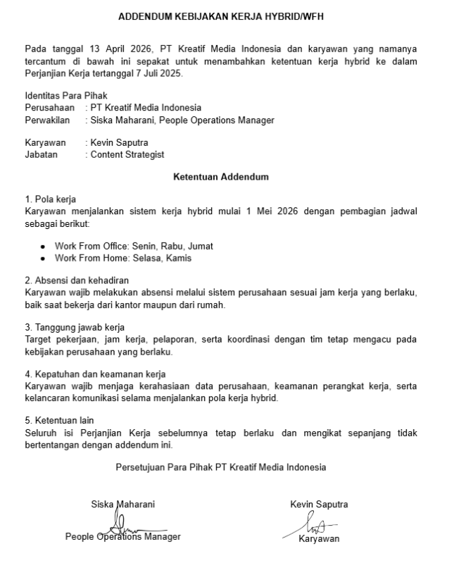 Banyak addendum berkaitan langsung dengan kegiatan operasional sehari-hari, seperti perubahan jam kerja, pola hybrid, WFH, atau pengaturan kehadiran.
