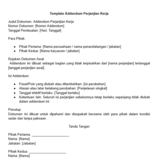 Template ini bisa untuk master dokumen internal HR agar setiap kebutuhan perubahan kontrak bisa diproses lebih cepat tanpa harus membuat format baru dari nol.